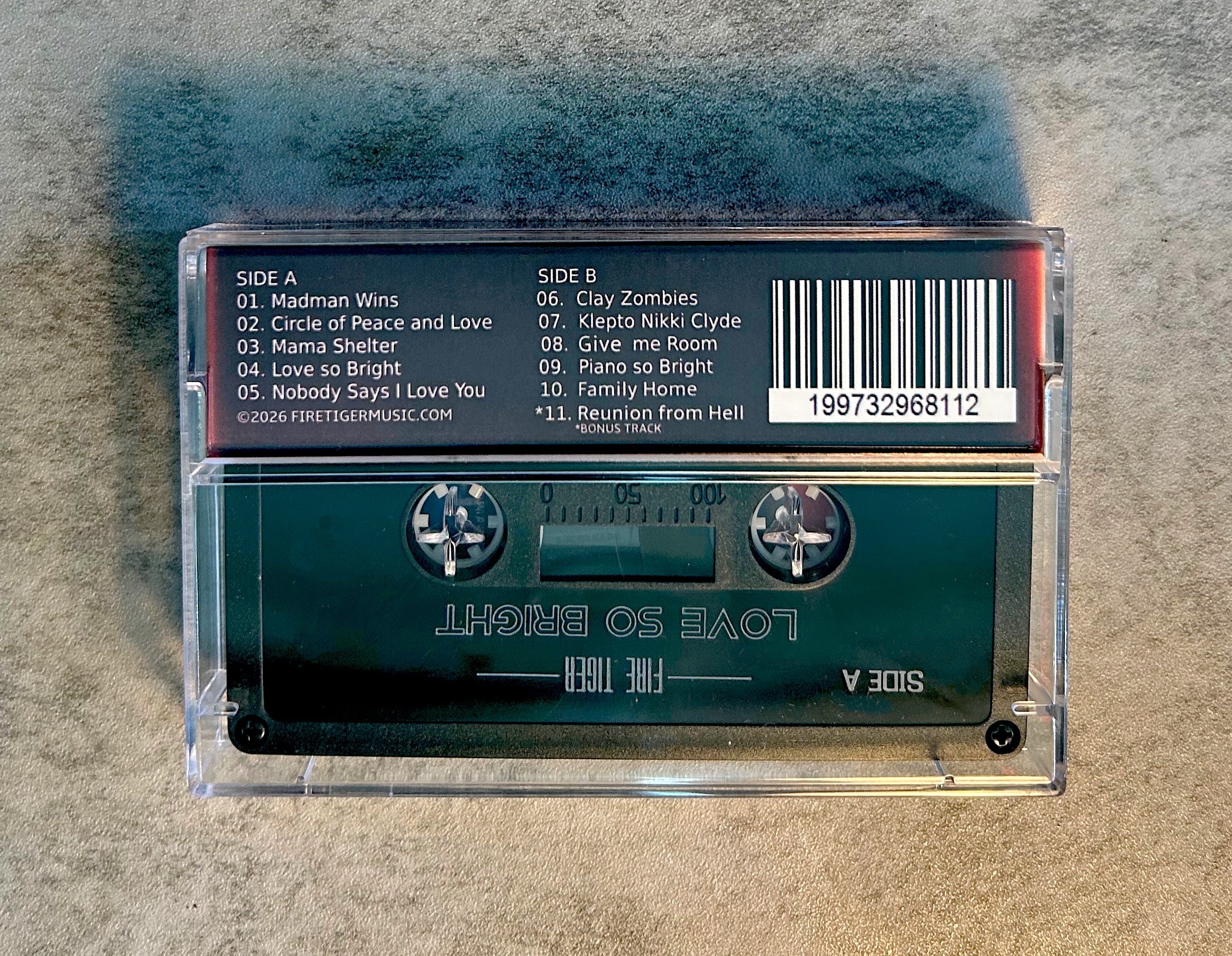 Fire Tiger's 2025 Album 'Love so Bright' Cassette with Lyrics Insert. Packaged and shipped to you with the utmost care, directly from us!! Flat rate shipping added at checkout, $5.60 US, $25 International.